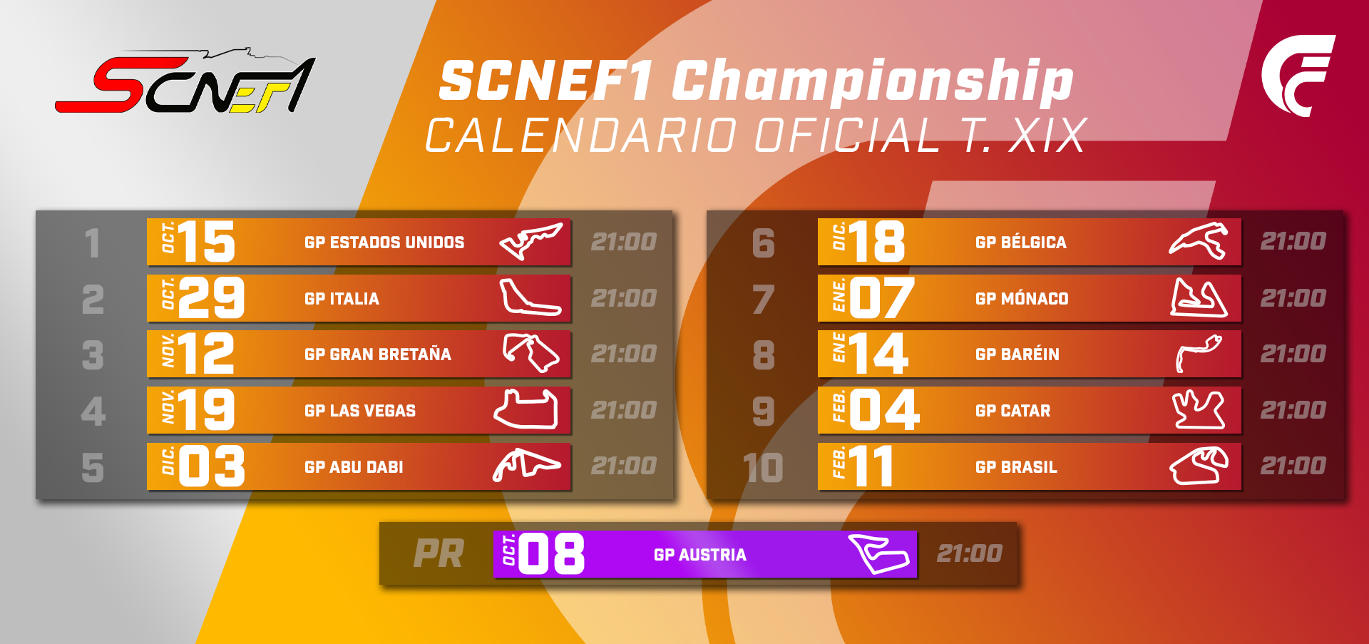 - La SCNEF1 T.XIX se disputará entre los meses de octubre de 2025 y febrero de 2026. La PR se disputará el 8 de octubre y concluirá el 11 de febrero con la última carrera.