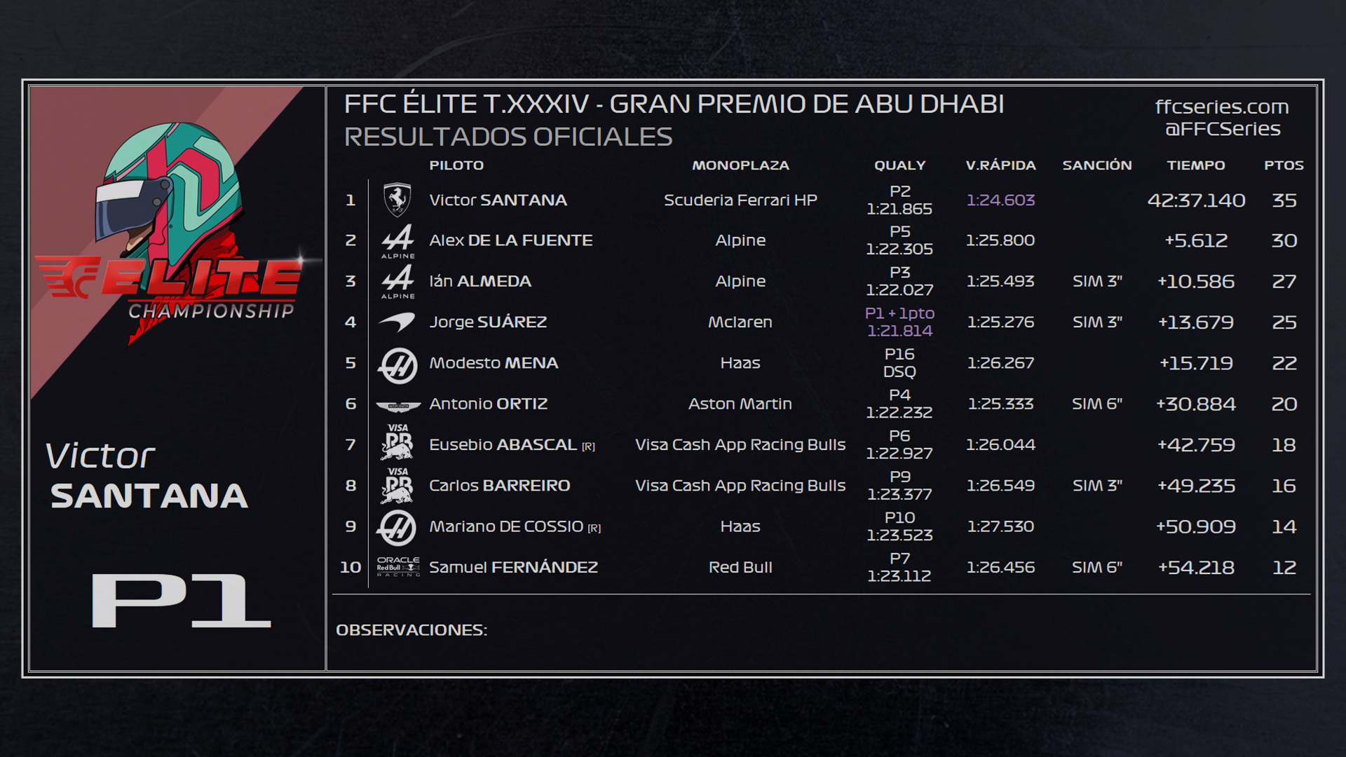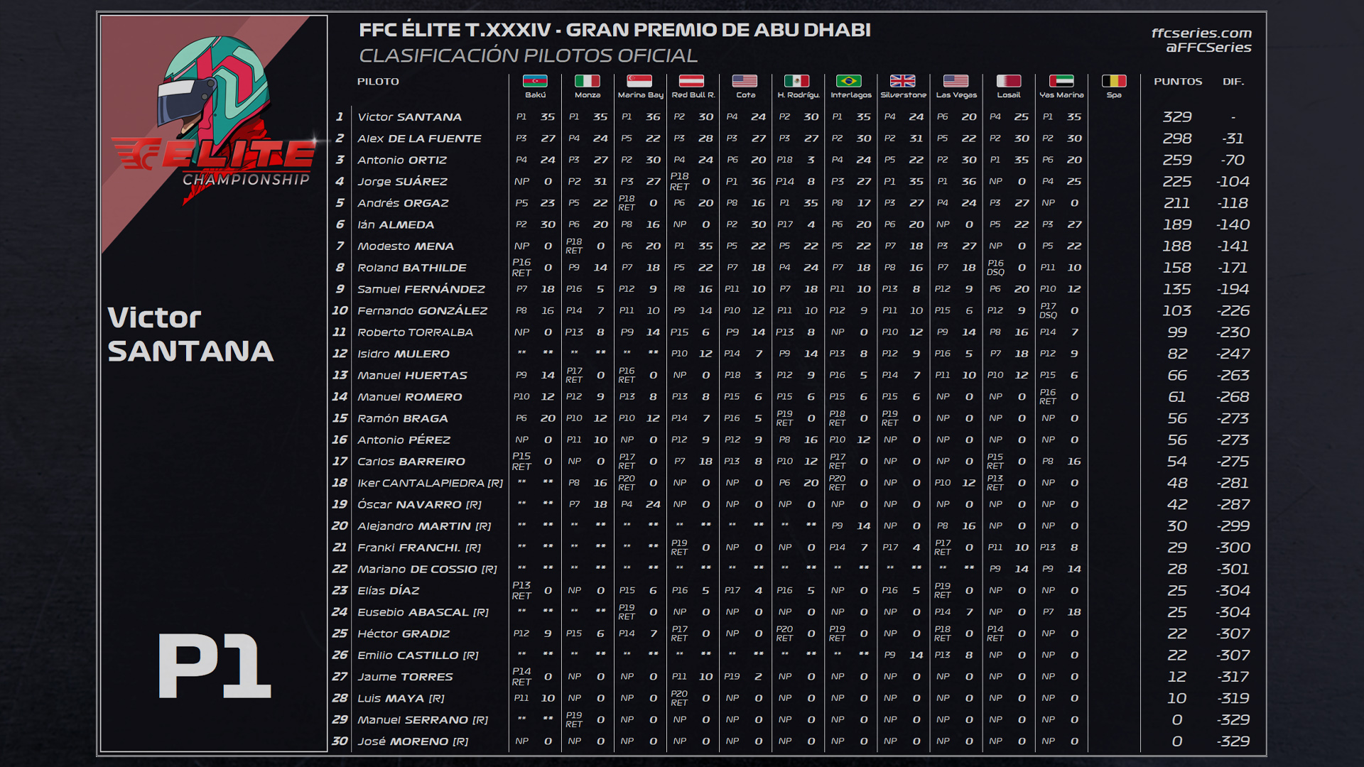 la Organización de FFC da por oficiales los siguientes resultados del campeonato FFC Élite en Abu Dhabi.