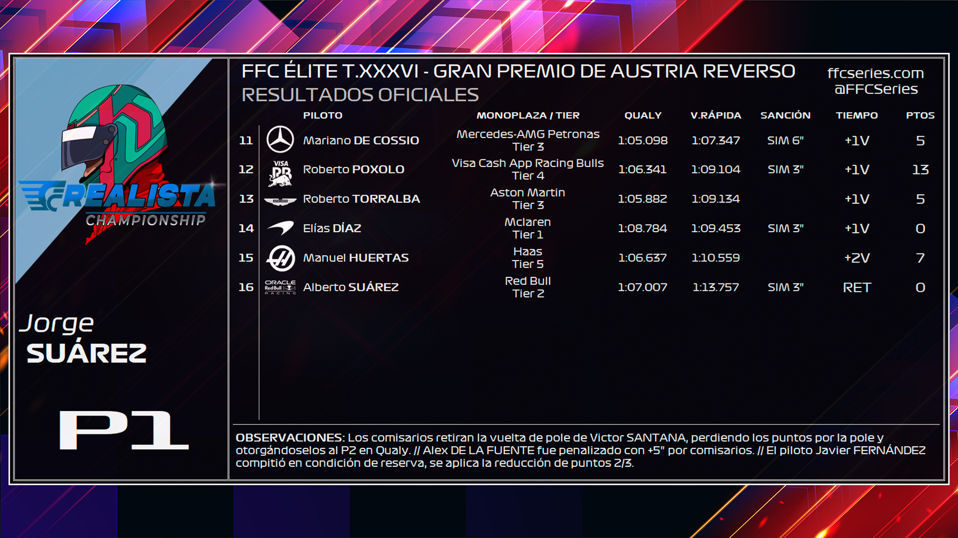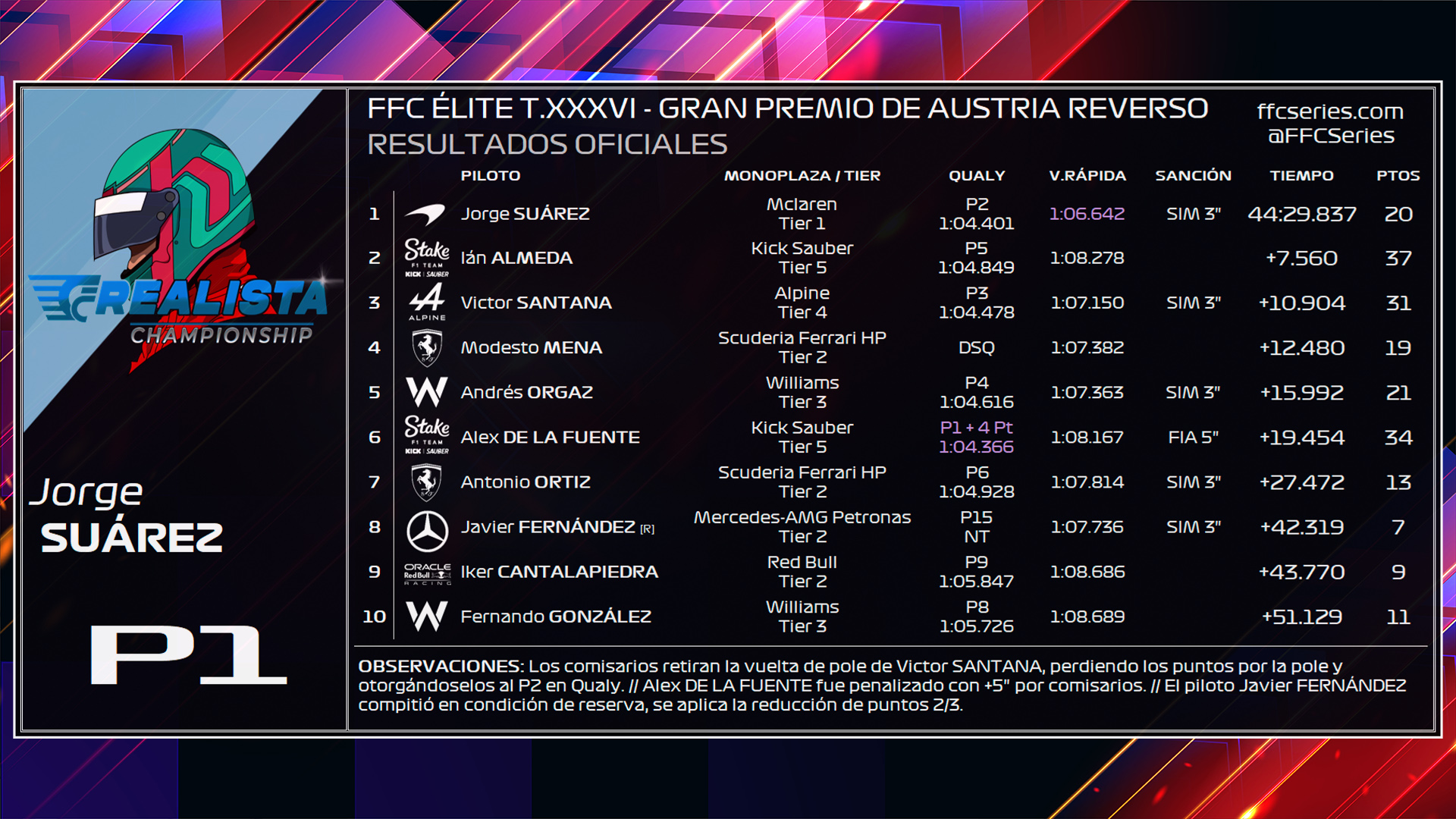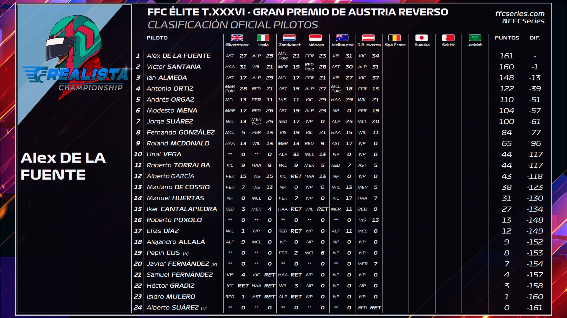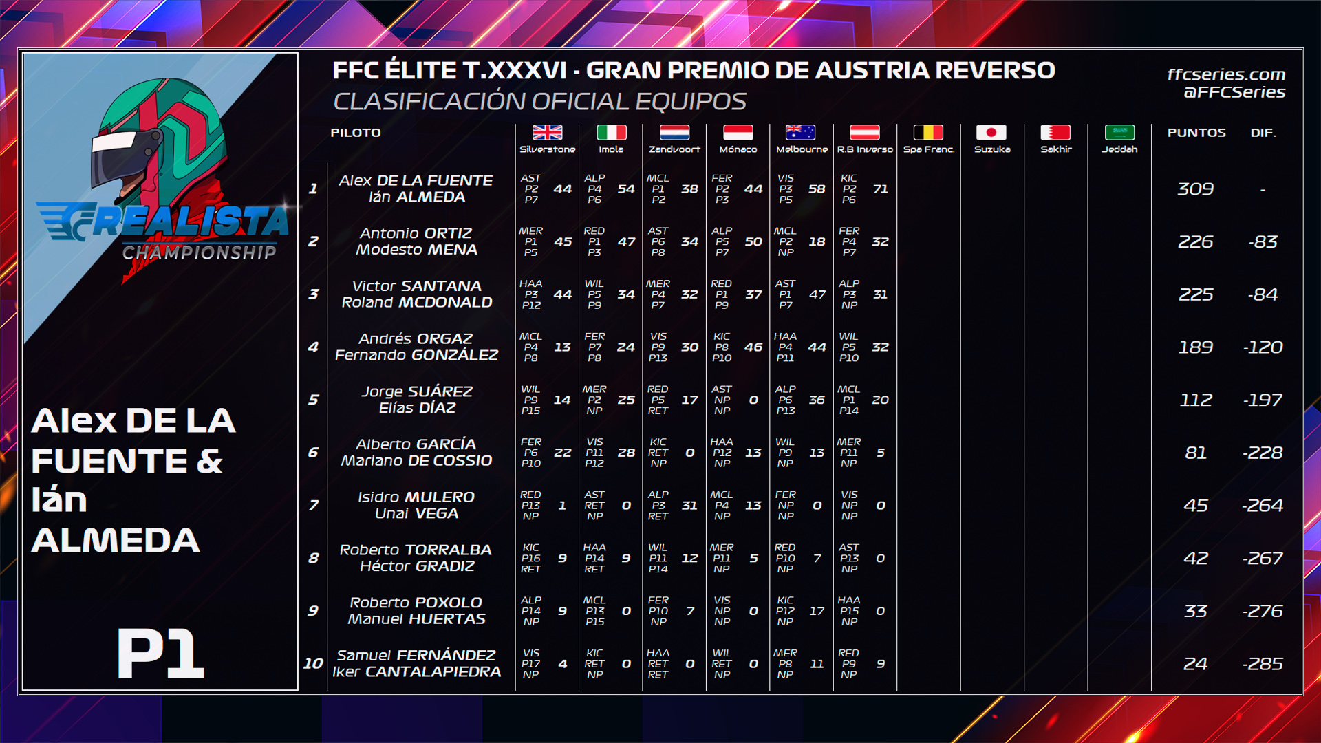 la Organización de FFC da por oficiales los siguientes resultados del campeonato FFC Élite en Austria Reverso.